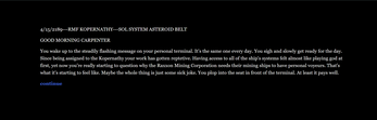 This is a small Twine game I made for a writing class. You play a special role known as Carpenter aboard an asteroid mining ship. When things fall apart, it's up to you to handle the situation.